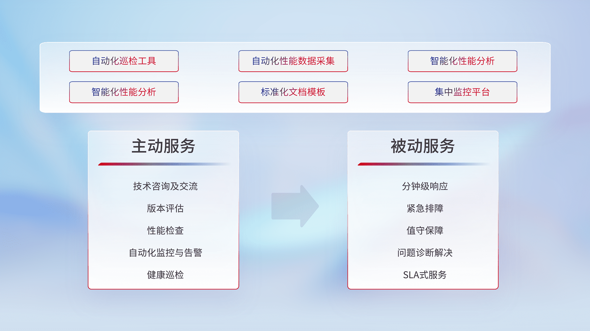 智能化工具和标准化文档,,,保障服务质量,,,提供主动服务(包含技术咨询、、、版本评估、、、性能检查、、自动化监控与告警、、、、健康巡检)和被动服务包含(分钟级响应、、、、紧急排障、、、值守保障、、、、问题诊断解决、、SLA服务)。。。。